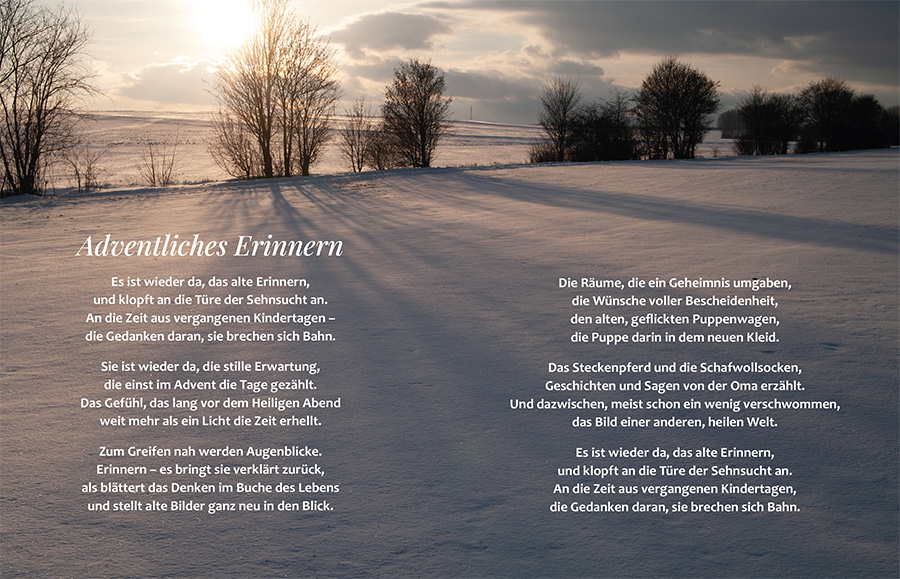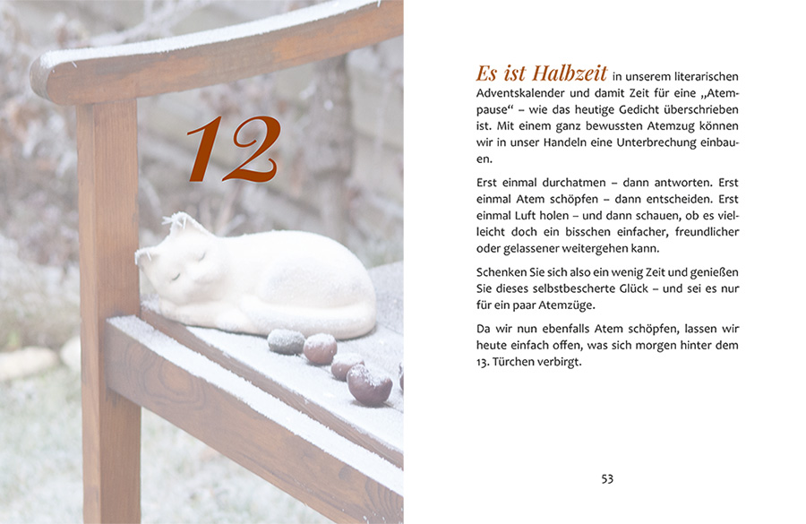 Jedem der 24 Tage bis Weihnachten sind zwei Doppelseiten gewidmet: ein Foto als Türchen mit einem kleinen Tagesimpuls und das Gedicht vor einem stimmungsvollen Bildmotiv.